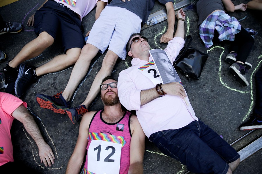 Read moreMarchers participate in a die-in while holding pictures of those killed in the Orlando mass shooting as others in their contingent chant “silence equals death” at the San Francisco LGBT Pride Parade in San Francisco, California, June 26, 2016. #