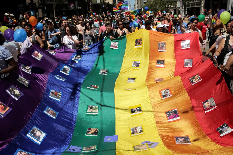 Read moreMarchers hold a rainbow flag with photos of the victims of the Orlando mass shooting during the San Francisco LGBT Pride Parade in San Francisco, California, June 26, 2016. #