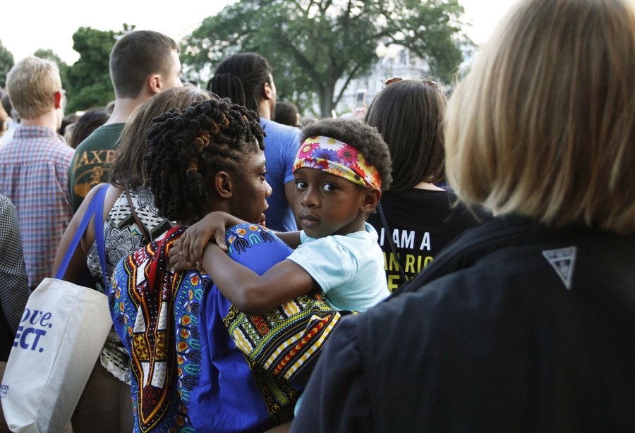 Read moreAutumn Baptiste, 5, middle, and her mother Shamika Cherry, left, attend a protest outside the White House concerning police brutality, July 7, 2016, in Washington, D.C. #
