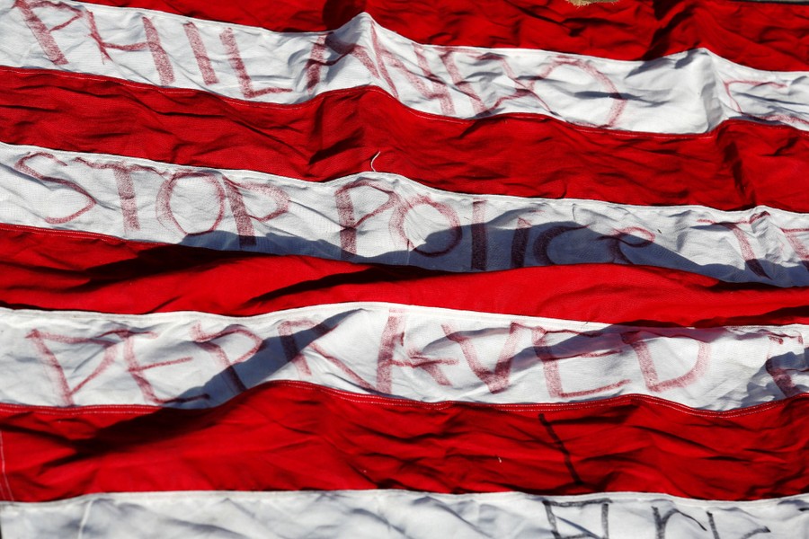 Read more"Stop Police" written by activists is seen on a U.S. flag as they protest on the corner of Florence Ave and Normandie Ave against the police shootings that lead to two deaths in Louisiana and Minnesota, respectively, in Los Angeles, California, July 7, 2016. #