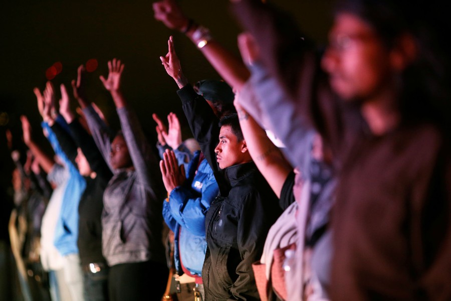 Read moreDemonstrators raise their hands toward a line of police officers on Highway 880 during a protest against the police shootings that lead to two deaths in Louisiana and Minnesota, respectively, in Oakland, California, July 7, 2016. #