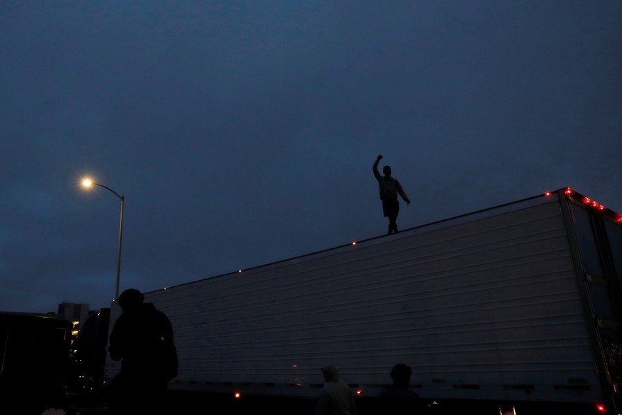 Read moreA demonstrator gestures from the top of a trailer truck during a protest against the shootings that lead to two deaths in Louisiana and Minnesota, respectively, in Oakland, California, July 7, 2016. #