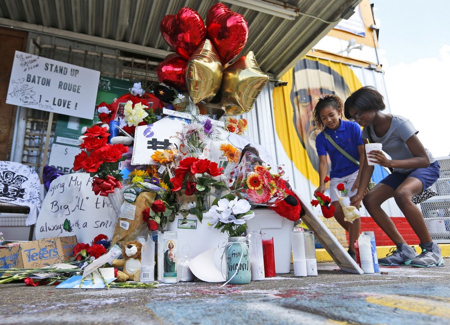 Read moreSavannah Greene, 11, and Alexis Marshall, 13, leave flowers at a makeshift memorial outside the Triple S Food Mart where Alton Sterling was fatally shot by police in Baton Rouge, Louisiana, July 7, 2016. #