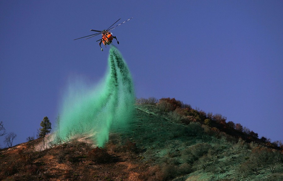 Read moreAn Erickson Skycrane fire-fighting helicopter drops green Hydromulch on Griffith Park hillsides where, months before, a wildfire burned more than 1,000 acres of native brush on about 25 percent of the nation's biggest urban park on October 19, 2007 in Los Angeles, California. The city has hired experts to blanket 480 acres with Hydromulch at a cost of $2 million to fertilize and stabilize denuded slopes that could give way during winter rainstorms. The hills are primarily covered with native Chaparral brush habitat which has depended for thousands of years on a cycle of natural wildfires to maintain the health of the ecosystem. #
