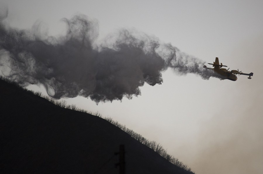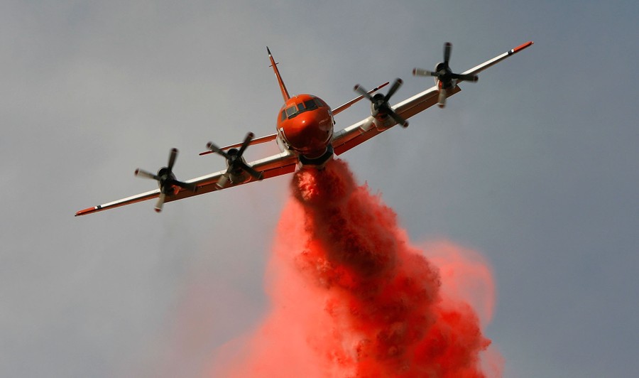 Read moreA firefighting air tanker drops Phos-check fire retardant near firefighters cutting a line on a ridge in the steep and rugged terrain rising into the San Gabriel Mountains to fight the Sierra Fire on April 28, 2008, near Sierra Madre, California. #