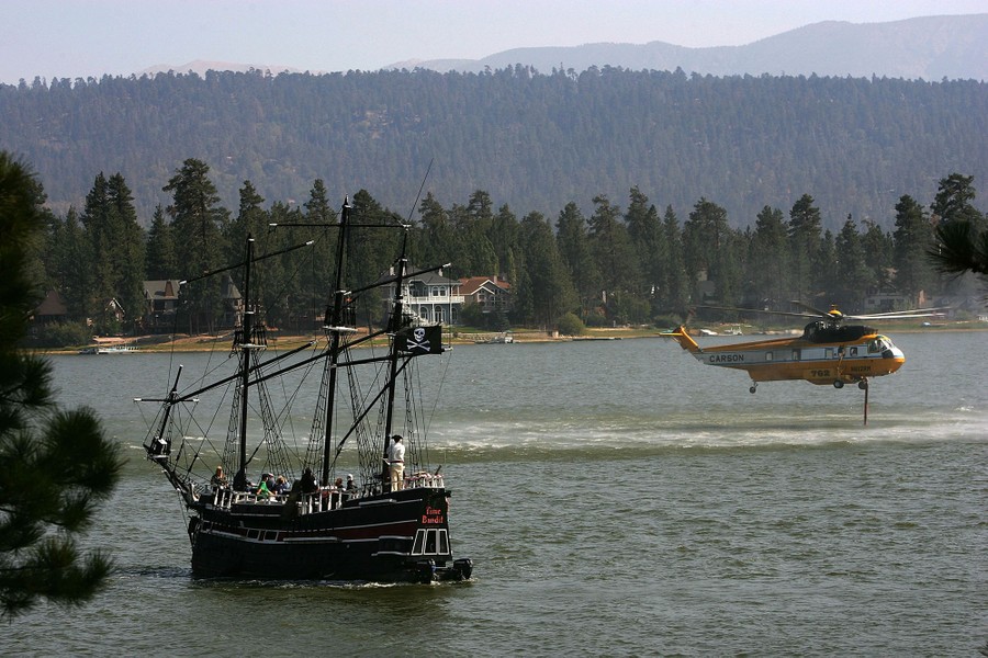 Read morePassengers on a pirate-themed ship watch as a Carson Super S-61 firefighting helicopter draws up water from Big Bear Lake while fighting the Butler 2 Fire on September 18, 2007, near Fawnskin, California. #
