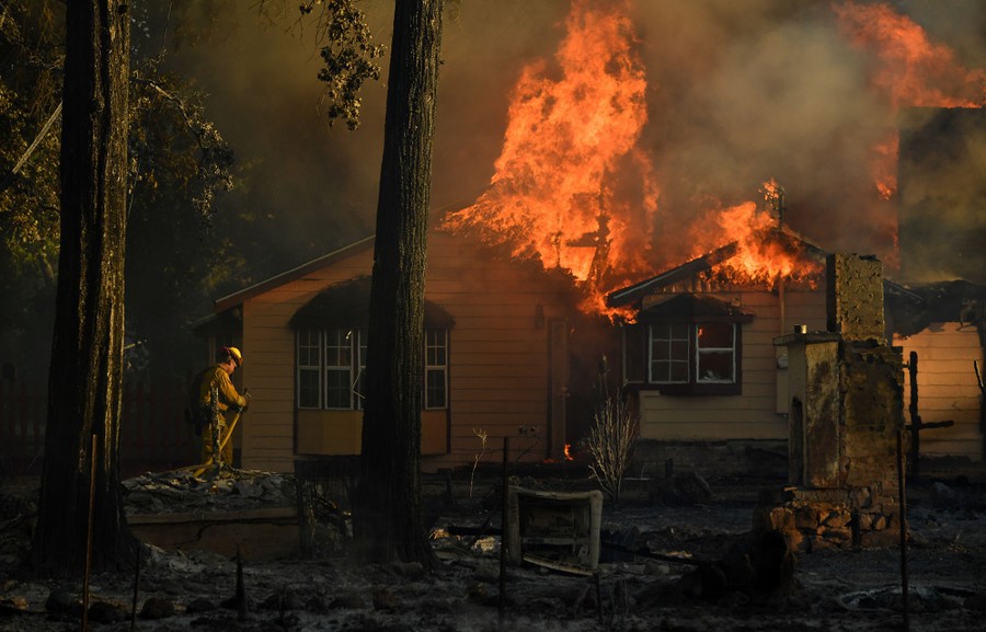 After five years of drought conditions, wildfires across California remain a common occurrence. At the moment, the Clayton Fire in Lake County and the Bluecut Fire in the San Bernardino National Forest are causing tens of thousands of residents to evacuate. The Bluecut Fire alone has consumed more than 30,000 acres, and has forced the evacuation of more than 82,000 people. In Lake County, a man was arrested and charged with arson for starting the wildfire that has destroyed more than 175 buildings so far. Below are images from the past few days of the destruction, and those who are battling the blazes, rescuing people and animals, and those caught up int he chaos.