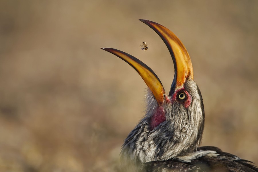 Read moreTermite tossing. Termite after termite after termite – using the tip of its massive beak-like forceps to pick them up, the hornbill would flick them in the air and then swallow them. Foraging beside a track in South Africa’s semi-arid Kgalagadi Transfrontier Park, the southernyellow-billed hornbill was so deeply absorbed in termite snacking that it gradually worked its way to within 6 meters (19 feet) of where Willem sat watching from his vehicle. Though widespread, this southern African hornbill can be shy, and as it feeds on the ground – mainly on termites, beetles, grasshoppers and caterpillars--it can be difficult for a photographer to get a clear shot among the scrub. The bird feeds this way because its tongue isn’t long enough to pick up insects as, say, a woodpecker might, and though its huge bill restricts its field of vision, it can still see the bill’s tip and so can pick up insects with precision. #