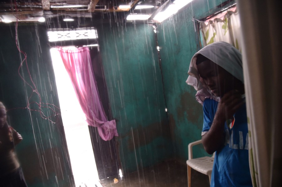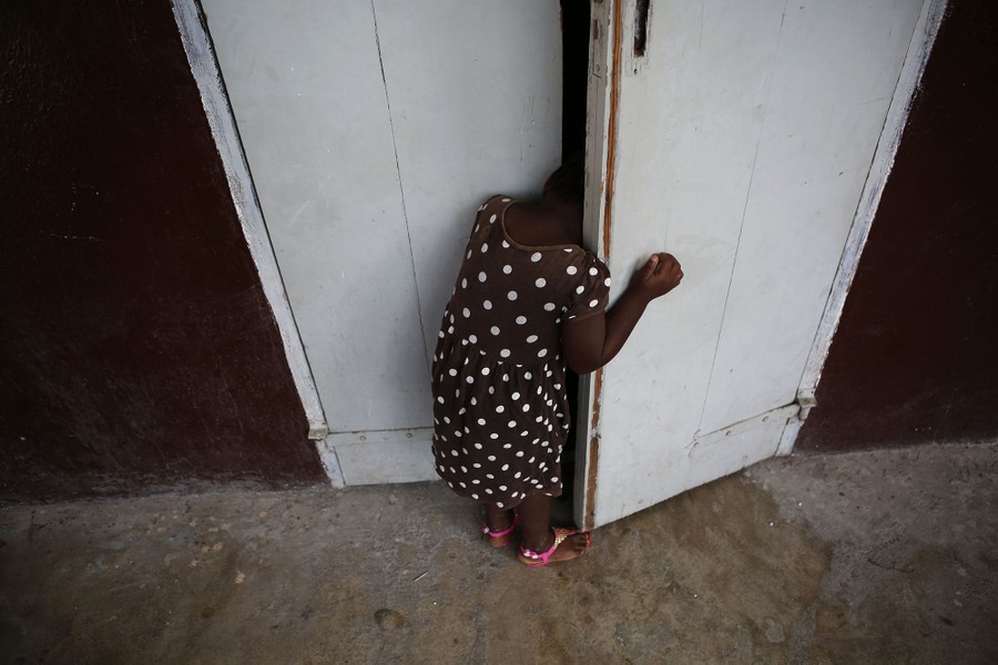 Read moreA little girl peers in to a darkened classroom where people whose homes were destroyed by Hurricane Matthew were sleeping, at Philippe Guerrier High School in Les Cayes on October 17, 2016. #