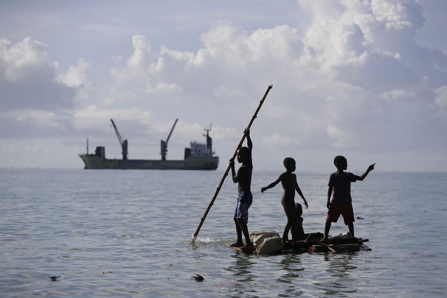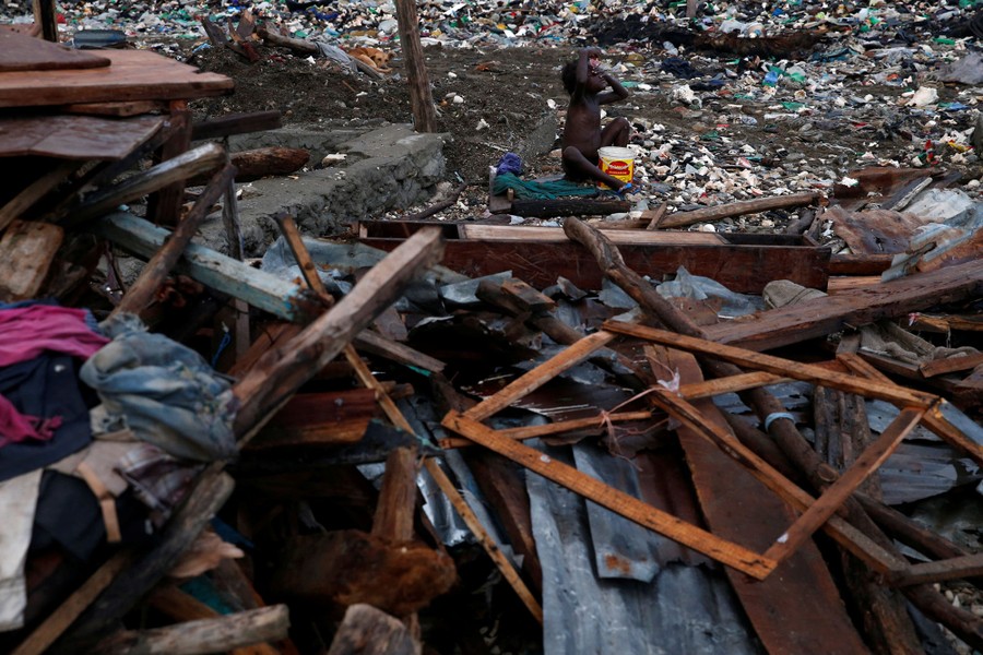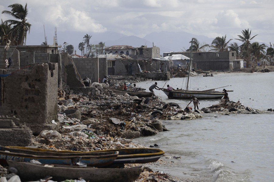 Read moreChildren play with a damaged fishing boat on a heavily polluted waterfront in the Philanthrope neighborhood of Les Cayes, Haiti, on October 17, 2016. Many houses in the seaside fishing community lost their roofs and others were completely destroyed. #