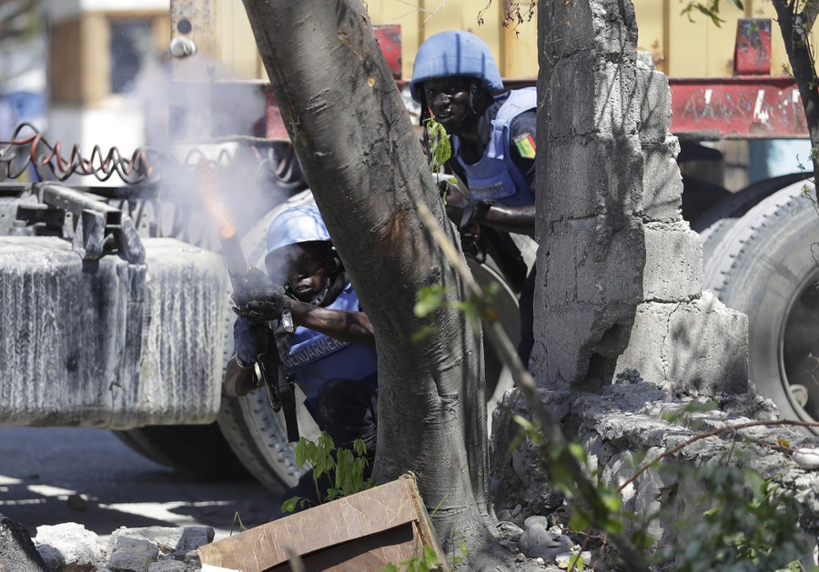 Read moreA U.N. peacekeeper from Senegal fires tear gas in front of a truck carrying food aid, as troops clash with rock-throwing neighborhood residents outside a U.N. base in Les Cayes, Haiti, on October 15, 2016. Residents said clashes with the peacekeepers began when trucks carrying food aid arrived at the base. #