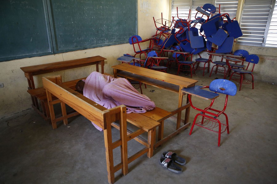 Read moreA young man sleeps on school benches pushed together in Philippe Guerrier High School, which is serving as a shelter for people whose homes were destroyed by Hurricane Matthew, in Les Cayes on October 17, 2016. School officials have told the more than one hundred people sheltering there that they will have to leave to allow classes to begin again, but those who lost their homes say they have no other shelter to go to. #