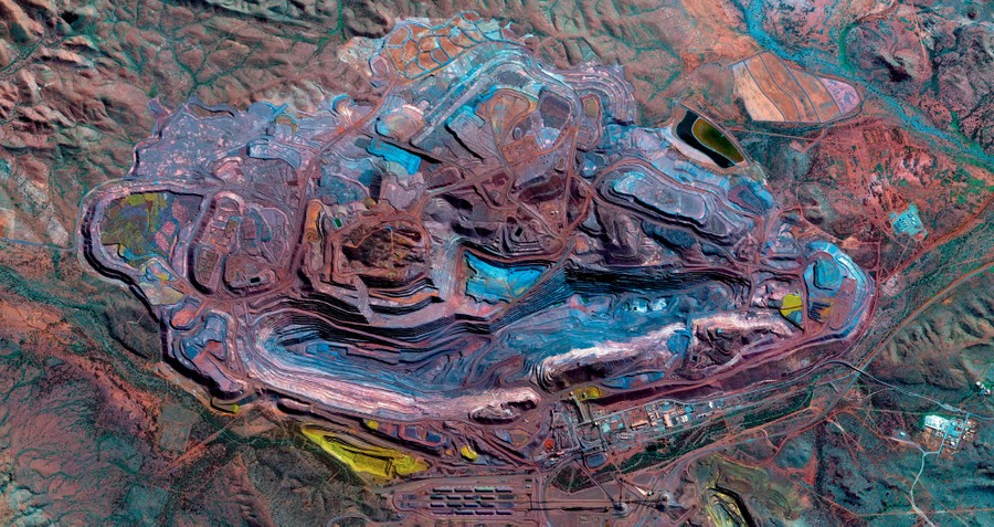 Read more–23.362130°, 119.669422° The Mount Whaleback Iron Ore Mine is located in the Pilbara region of Western Australia. Ninety-eight percent of mined iron ore is used to make steel, and it is thus a major component in the construction of buildings, automobiles, and appliances such as refrigerators. #