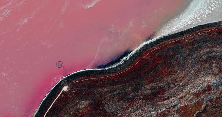 Read more41.437932°, –112.668929° The Spiral Jetty is an earthwork sculpture by Robert Smithson, consisting of a 1,500‑foot-long (460-meter), 15-foot-wide (4.6-meter) counterclockwise coil jutting from the northeastern shore of the Great Salt Lake in Utah. Smithson reportedly chose this site because of the vibrant colors of the water (salt‑tolerant bacteria and algae thrive here in water with 27 percent salinity) and its similarity to the Earth’s ancient seas. #
