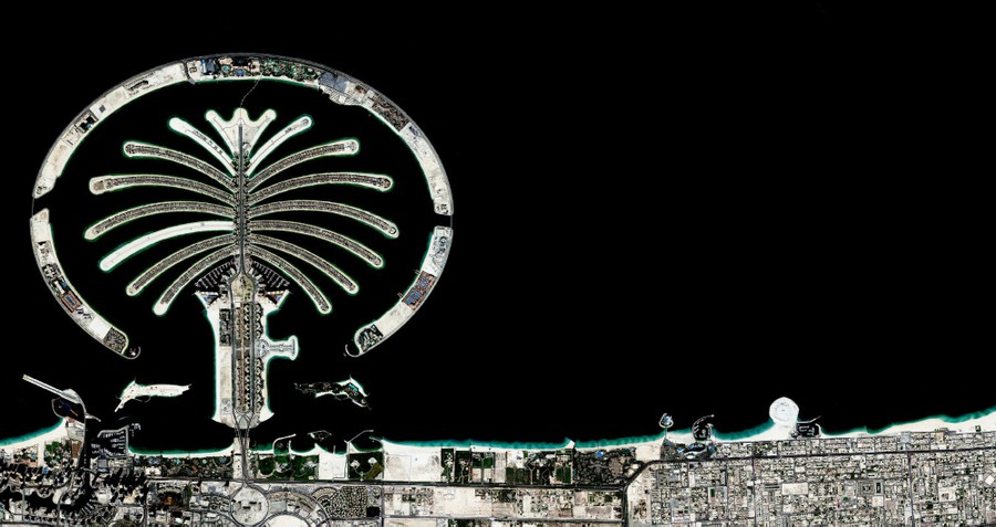 Read more25.119724°, 55.126751° The Palm Jumeirah in Dubai, United Arab Emirates, is an artificial island that was created with 4.3 billion cubic yards (3.3 billion cubic meters) of sand and 7 million tons of rock. It is estimated that the island is now home to approximately 26,000 people. #
