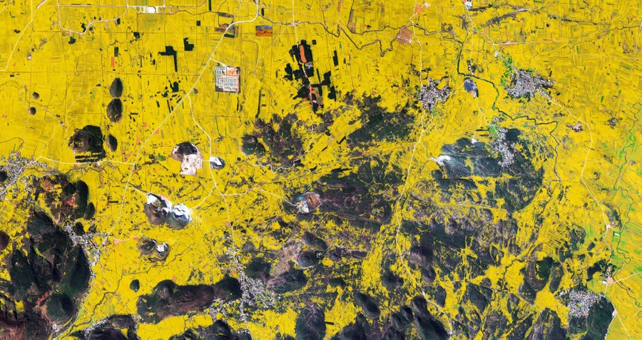 Read more24.857405°, 104.353534° Canola flower fields cover the mountainous landscape of Luoping County, China. The crop is grown for the production of oil, which is extracted by slightly heating and then crushing the flower seeds. Canola oil is primarily used as a source of biodiesel. #