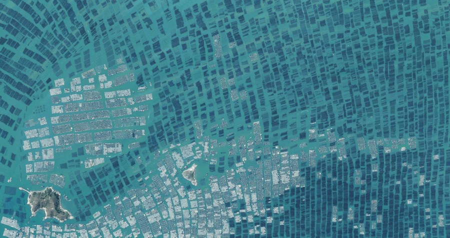 Read more26.408924°, 119.741132° Seafood farms cover the surface of Luoyuan Bay in the Fujian province of China. Underneath the water is a vast network of lines, cages, and nets for the growth of various seafood species, including crabs, lobsters, scallops, and carp. For a sense of scale, this Overview shows approximately 2.3 square miles (6 square kilometers). #