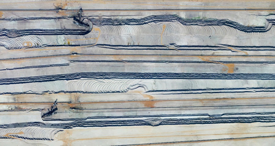 Read more50.911368°, 6.547357° Bucket-wheel excavators run on tracks at the Tagebau Hambach open-pit mine in Etzweiler, Germany. These massive vehicles—considered to be the largest land machines in the world at 315 feet (96 meters) tall and 730 feet (223 meters) long—continuously scoop materials from the surface in order to extract lignite. Lignite, often referred to as “brown coal,” is a soft, combustible sedimentary rock that is formed from naturally compressed peat and is used as a fuel for steam-electric power generation. #