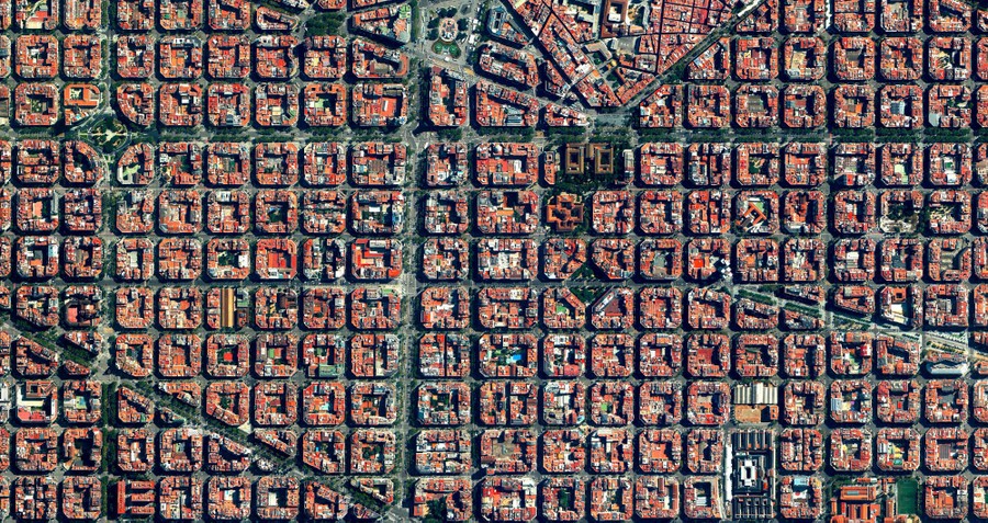 Read more41·393648°, 2·160437° The Eixample District in Barcelona, Spain is characterised by its strict grid pattern and apartments with communal courtyards. This thoughtful and visionary design was the work of Ildefons Cerdà (1815–1876). His plan features broad streets that widen at octagonal intersections to create greater visibility with increased sunlight, better ventilation, and more space for short-term parking. #