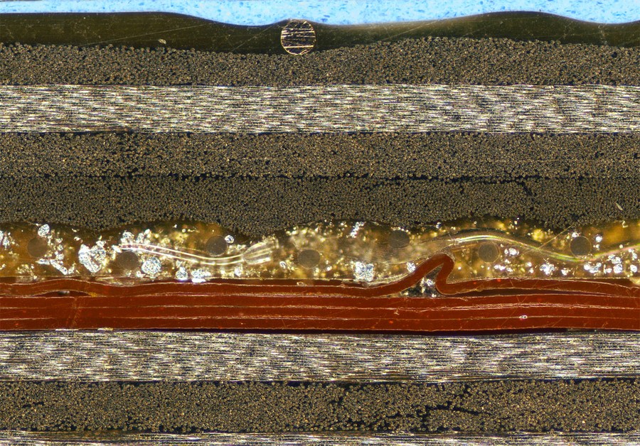 Read moreCross-section through a multi-layered carbon-fiber reinforced composite structure for defect analysis (100x). #