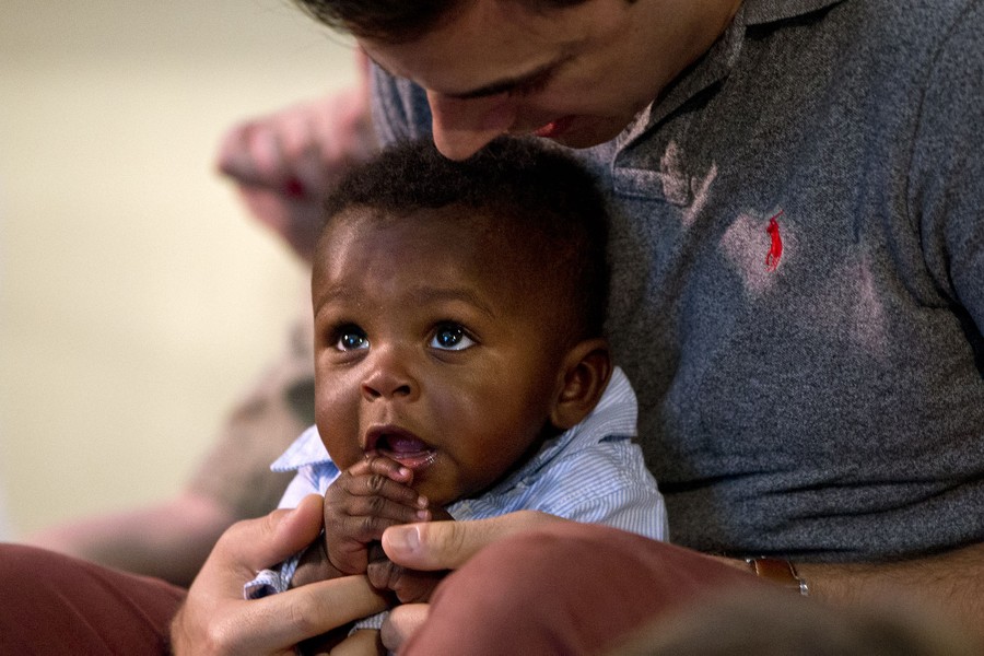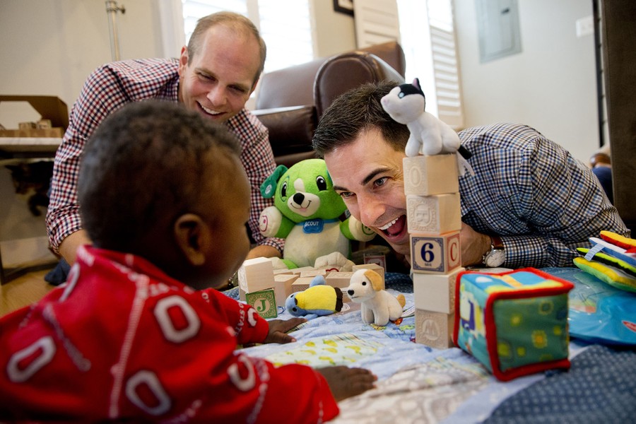 Read moreGregg Pitts, left, and Brooks Brunson play with their son, Thomas Brunson-Pitts, 6 months, during "tummy time" before heading to work, while in their home in Washington, on May 19, 2016. The child's birth mother had no problem with a same-sex couple adopting the baby. "We're an interracial same-sex couple family," says Brunson, "But our day-to-day life is picking up dry cleaning, getting to work on time, making sure Thomas has his bottle prepared - we're the most boring people I know. But then when I take a step back I realize we are very unique. But I believe this is exactly where God wants me to be." #