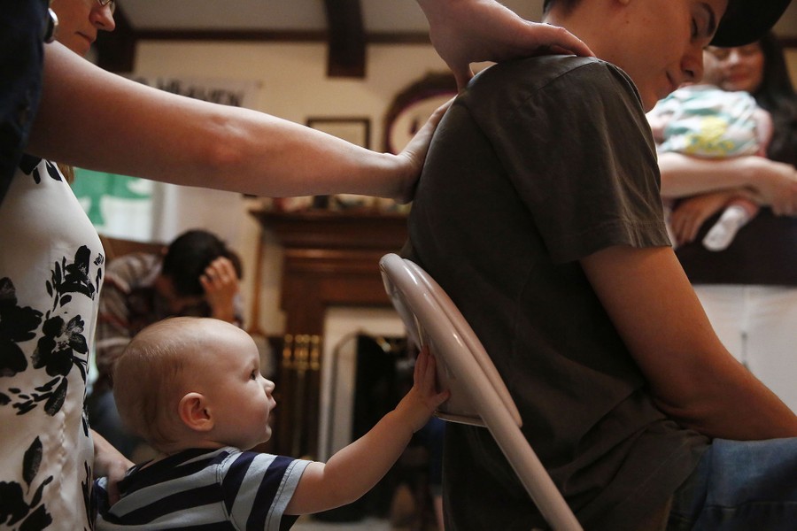 Read moreYoung Judson Taylor, center, mimics his mother Rachel Taylor, left, as they pray for a church member in the living room of their home church on May 22, 2016, in Birmingham, Alabama. #