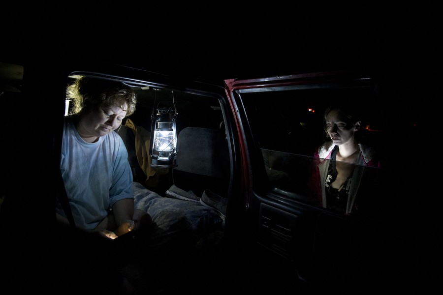 Read moreUsing the light from a lantern in the dark night, Monica Hicks, 47, of Meadowview, Virginia, left, and her daughter Heather Romans, 28, get ready to sleep in their car overnight so that they will have good ticket numbers to attend the free Remote Area Medical (RAM) clinic the next morning, in Smyth County, Virginia, on April 28, 2016. Hicks, who needs glasses and has no vision coverage, is attending RAM with her daughter, who needs major dental work, to have their dental and vision care needs met free of charge. Romans suffers from Muscular Dystrophy which can impact dental health. She has dental insurance coverage that provides 80% of fees but needs so many of her teeth pulled that she can not afford to cover the remaining 20% herself. RAM provides free medical care for low income people and to people who do not have health insurance in several states across the country. Specializing in free dental, vision, and medical care in isolated and poverty stricken communities, the group sets up mobile medical centers and is having their 800th such event this year. "I've done foreign volunteer missions before," says volunteer dentist Mark Copas, "but never domestic. These cases are just as bad as what I've seen in third world countries." #