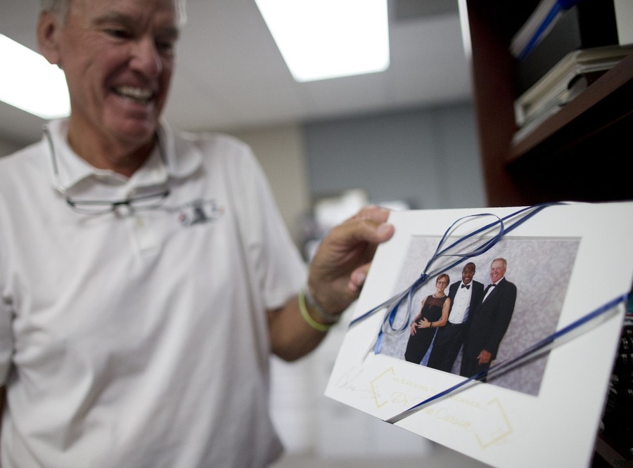Read moreIn this May 4, 2016 picture, Duncan Wallace displays a picture of himself and his wife standing alongside former Republican presidential candidate Ben Carson on May 4, 2016, in Vista, California. #