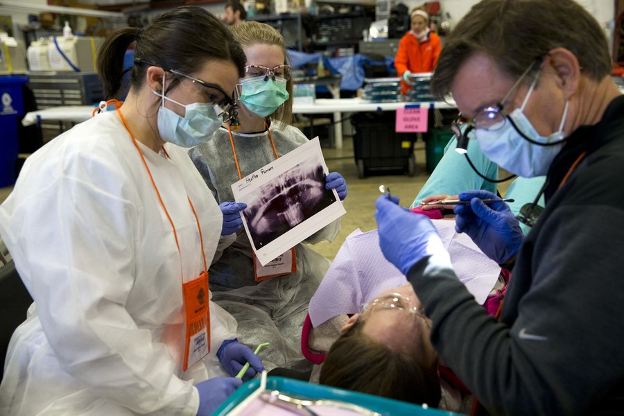 Read moreRandi Honaker, left, and Kayla Rose, volunteer dental hygiene students, show an x-ray of the mouth of Heather Romans, 28, in dental chair, to volunteer oral surgeon Neil Hollyfield, of Marion, Virginia, as he evaluates which teeth need to be extracted during the first Remote Area Medical clinic in Smyth County, Virginia, on April 29, 2016. Eight of her teeth were removed during the clinic. #