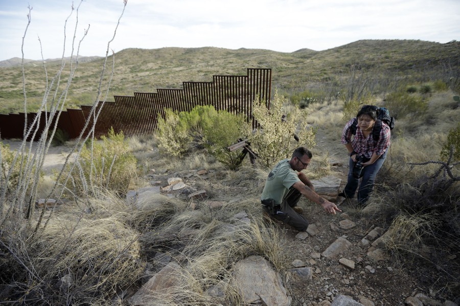 Read moreIn this May 11, 2016 picture, Tim Foley talks to journalist Marcie Mieko Kagawa near where a section of the border wall separating Mexico and the United States ends in Sasabe, Arizona, Foley, a former construction foreman, founded Arizona Border Recon, a group of armed volunteers who dedicate themselves to border surveillance. #