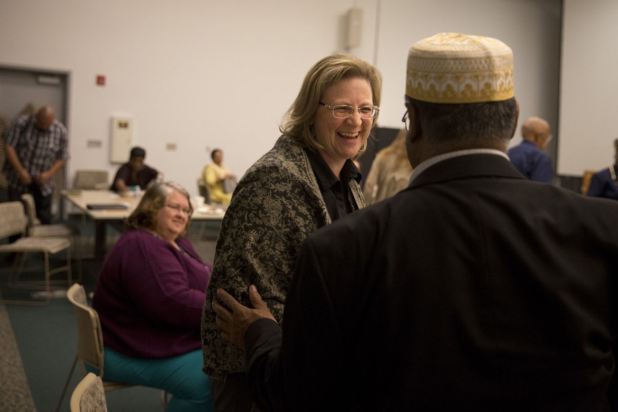 Read moreKaren Fagan shares a laugh with an attendee while participating in an interfaith community event on May 8, 2016, in Pomona, California, Fagan's ex-husband, Harry Bowman, the father of her two daughters, was killed in the previous year's terrorist attack in San Bernardino, California, But the tragic event didn't change her beliefs, and she began participating in interfaith community events. Fagan still thinks that the county should accept Muslim refugees. "America is full of lots of different people from lots of different places," said Fagan. "It saddens me that America is no longer the place where people can come to escape oppression... It's our obligation as Americans and Christians." #