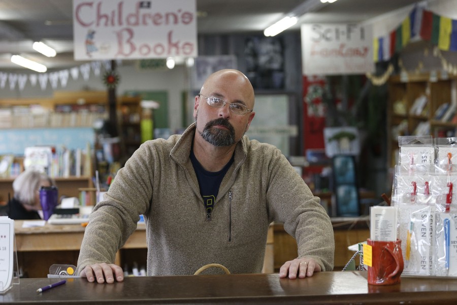 Read moreShawn Wathen stands for a photo inside his bookstore in Hamilton, Montana, on April 14, 2016. Wathen, who has called the sprawling Bitterroot Valley home for 20 years, sees the rejection of refugees as a blend of misinformation, economic anxiety and fear of the unknown. "It surpasses any notion of reason ... that kind of idea that they are not us, and therefore they pose a threat,” he says. “There's just that sense the horde is out there and if we don't circle the wagons ... we're going to be overrun and poor white America is going to suffer." #