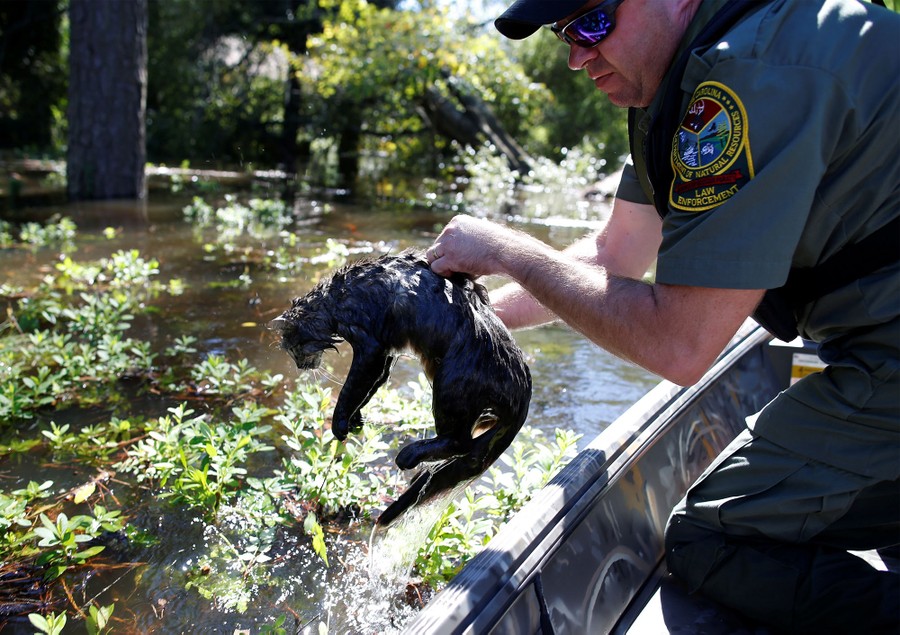 Read moreSouth Carolina Department of Natural Resources officer Gregg Lowery rescues a cat from floodwaters from Hurricane Matthew while patrolling for evacuees in Nichols, South Carolina, on October 10, 2016. #