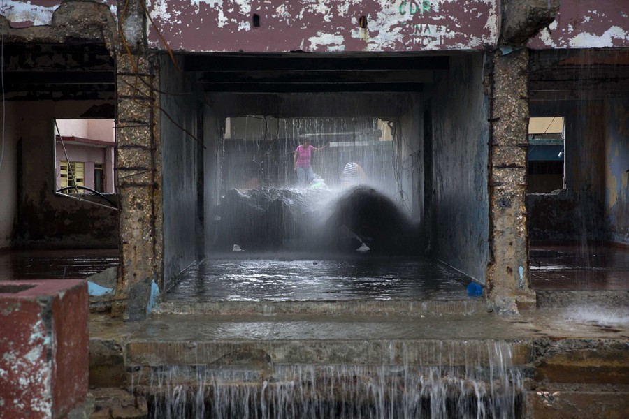 Read moreDavid Laffita, 26, cleans the entrance of his home, illuminated by an gas lamp constructed by Laffita using a piece of cloth, a bottle and gas, after the passing of Hurricane Matthew, in Baracoa, Cuba, on October 6, 2016. #