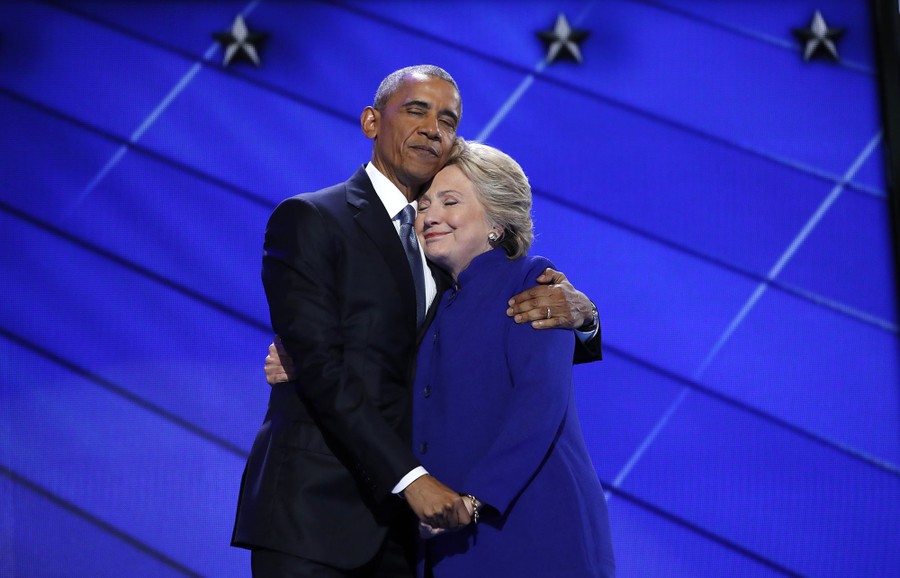 Read moreDemocratic presidential nominee Hillary Clinton hugs U.S. President Barack Obama as she arrives onstage at the end of his speech on the third night of the 2016 Democratic National Convention in Philadelphia, Pennsylvania, on July 27. #