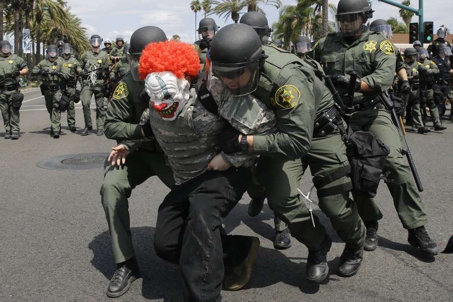 Read moreOrange County Sheriff's deputies arrest a protester near the Anaheim Convention Center on Wednesday, May 25, in Anaheim, California. Republican presidential candidate Donald Trump held a rally at the convention center. #