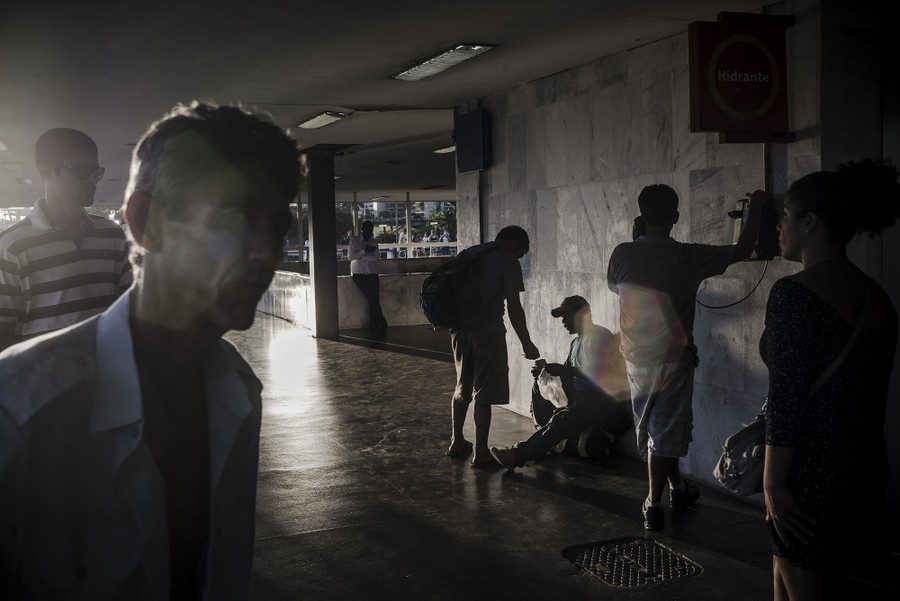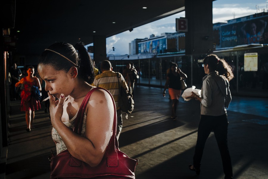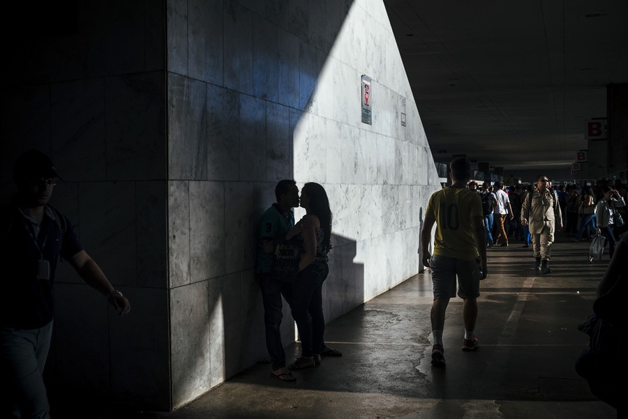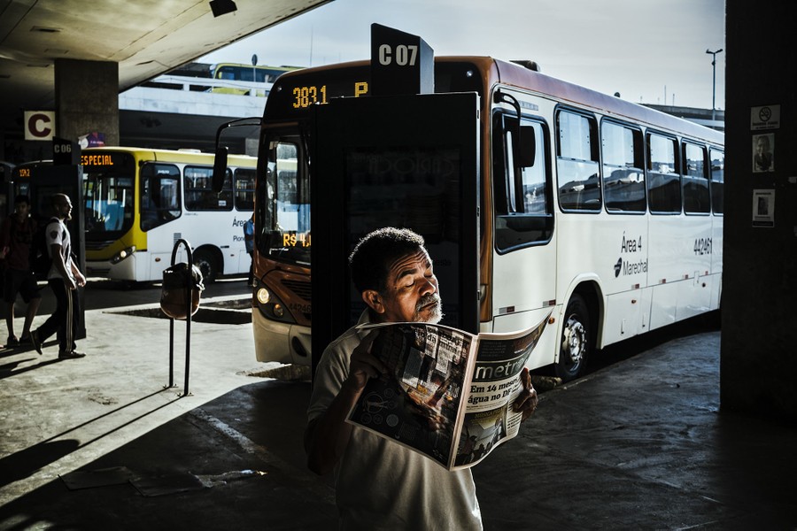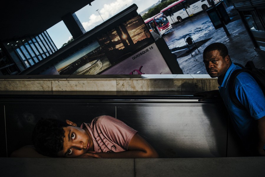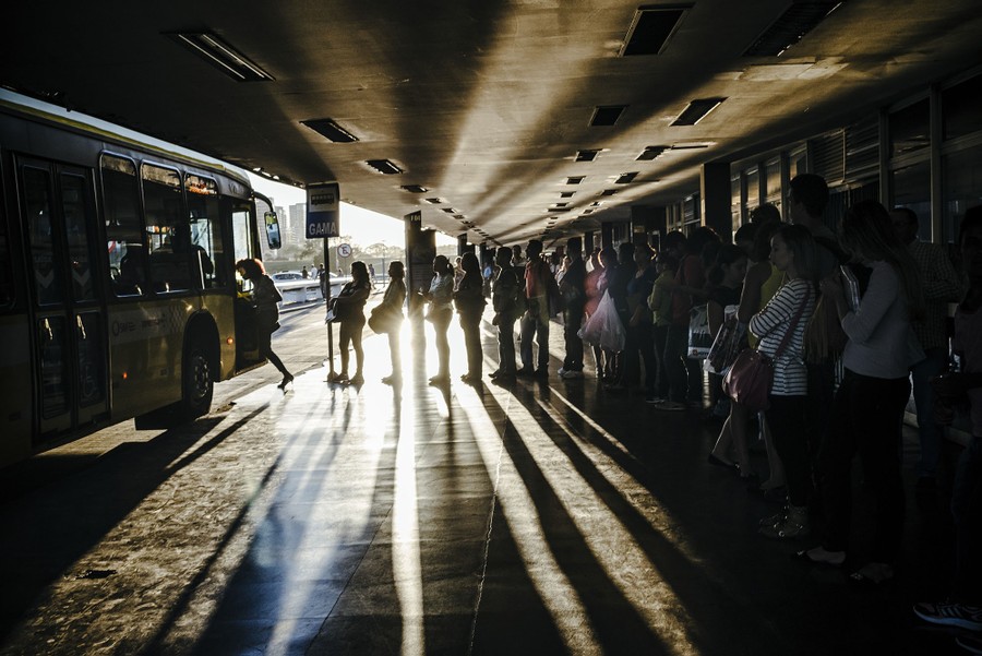 At first, photographer Gustavo Minas didn’t know what to make of Brasília. Originally from a bucolic town in Brazil’s countryside, he was surprised by the carefully plotted capital, which seemed static; the cavernous public spaces and modernist sidewalks were perennially empty. “The only place I could find some chaos and energy was in the central transport station,” he said. Nearly one million people pass through Rodoviária do Plano Piloto’s corridors daily, connecting the wealthy urban center with the less prosperous regions surrounding it. “It’s a place where two worlds mix—people both from the lower-class satellite towns and from the affluent blocks within Plano Piloto,” Minas said. “It’s also the place where many hopeless outsiders who come to the capital roam, trying to get a job or begging, sleeping under its arcades at night, by themselves or with their families.” Minas captures the frenzy of the transportation hub in his essay “Rodoviária,” or “Bus Stop,” with images that reveal a symphony of commuters, buses, shadows, glass, and concrete.