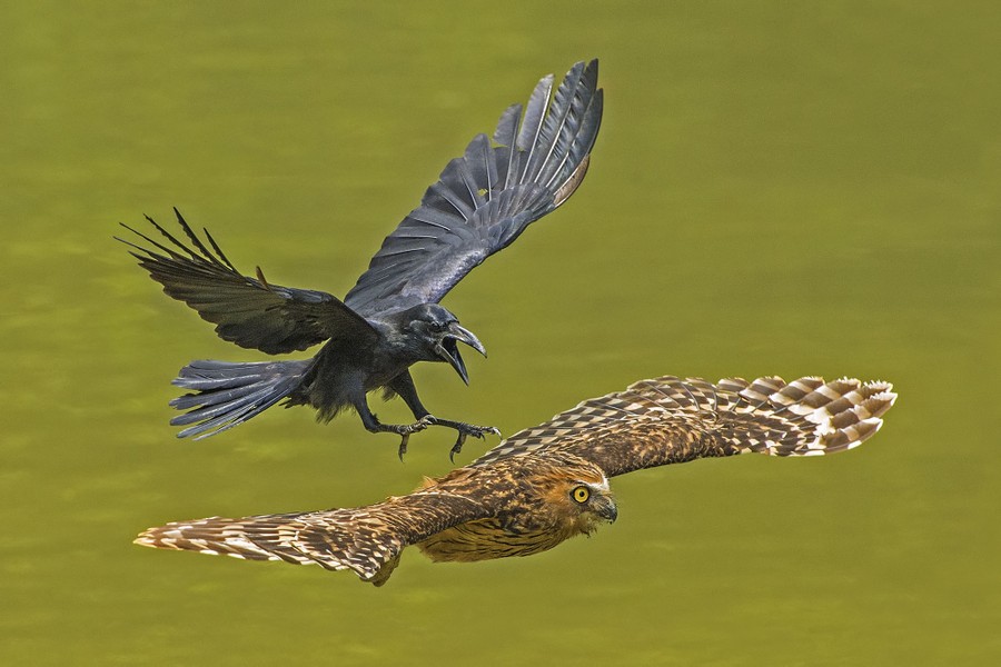 Read moreCrow Chasing Buffy Owl, Honorable Mention, Animal Portraits. This shot was taken on an early September afternoon along the riverbank at Pasir Ris Park in east Singapore. I was hoping to capture wildlife in action when some movement in the bushes nearby caught my attention. Instinctively, I prepared my equipment to capture any action that might ensue. I was fortunate enough to witness this adult crow chasing an adult buffy fish owl right in front of me, proving at once that the crow was the more aggressive species of the two. The entire spectacle between these day and night creatures lasted less than two seconds and exemplified nature in its uninhibited form. #