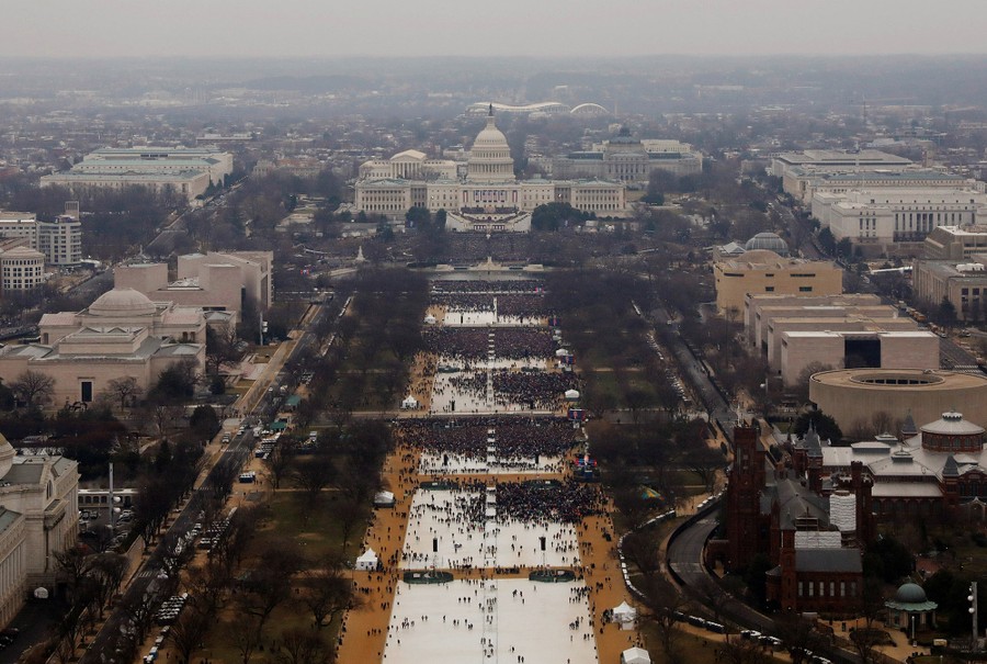 Without disputing Spicer’s claims about the total capacity of the area he describes, his summary claim that it was "full when the president took the Oath of Office" is demonstrably false. The following photographs taken by Reuters photographer Lucas Jackson show the mall from the top of the Washington Monument. Enlarging the pictures makes it possible to see video screens with President Trump delivering his inaugural speech, complete with visible captions that help establish the time at which they were taken.