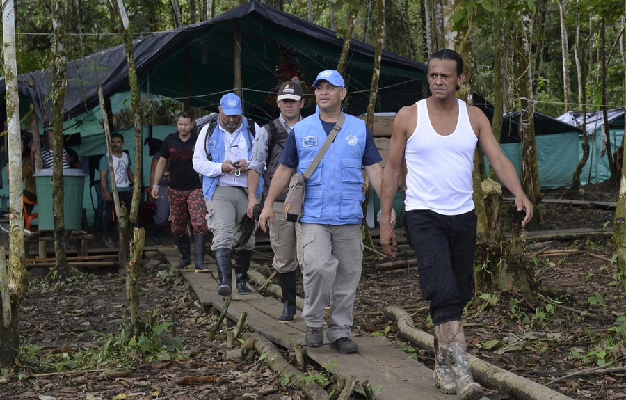 Read moreFARC guerrilla commander Pedro (right) walks with members of the United Nations Observation Mission during thier visit at the Front 34 Alberto Martinez encampment in the Vegaez municipality, Antioquia department, Colombia on January 2, 2017. #
