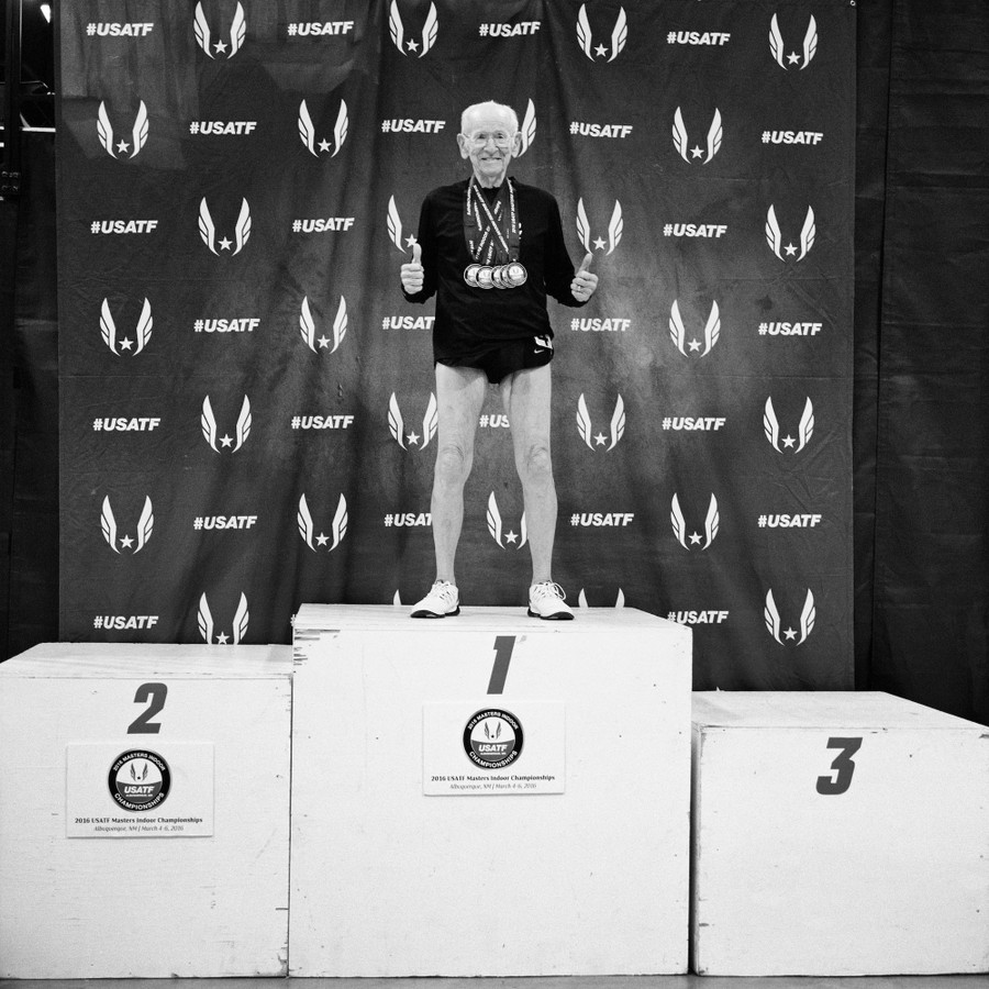 Read moreMasters track and field athlete Orville Rogers, 98, of Texas, poses for a photo on the medal stand at the USATF Masters Indoor Nationals at the Albuquerque Convention Center in Albuquerque, New Mexico. March, 2016. Rogers, who was the only competitor in his M95 age group, won the 60, 200, 400, 800, and 1500 meters. #