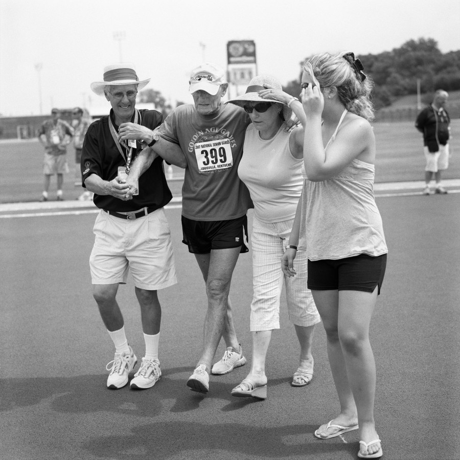 Read moreAn official and family members escort masters track and field athlete Seymour "Sid" Duckman, 88, of Florida, from the field after he high jumped .90 meters/ 2í 9.5î at the 2007 National Senior Games, held at the University of Louisville's Cardinal Park Soccer & Track Stadium in Louisville, Kentucky on June 28, 2007. Sid, who survived colon cancer in his late 60s, prostate cancer at 72 and kidney cancer at 80, had just undergone his 11th chemotherapy treatment for lung cancer. "I'm a mess," he said. "But I don't quit." Sid died in 2011. The event was sponsored by the National Senior Games Association, established in 1986, which oversees 50 state and 350 local and regional competitions for senior athletes in the United States each year. There are an estimated 250,000 senior athletes in training in the U.S. #