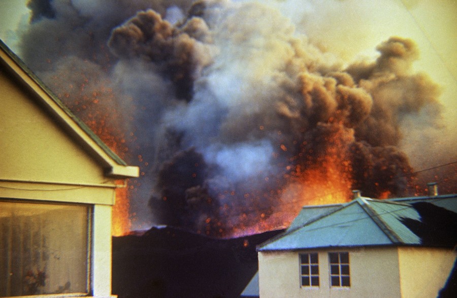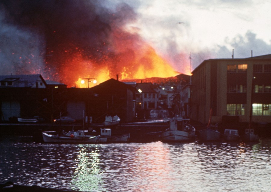 44 years ago, on January 23, 1973, a previously-unknown fissure in the Earth beneath the small Icelandic island of Heimaey opened up less than a mile from the town of Vestmannaeyjar, which had a population of about 5,000 at the time. Within a day’s time, almost the entire island was safely evacuated, and geologists began to monitor the eruption. The newly-formed Eldfell volcano erupted for about six months, covering much of Vestmannaeyjar in ash, destroying several hundred homes, and sending lava flows toward the harbor—at one point raising the water temperature to 111° F (44° C). An enormous and largely-successful effort was made to slow and control the lava flow by pumping seawater and spraying the leading edge of the flows. Within a year after the end of the eruption, most residents had returned, and today, the island remains inhabited, with a population of about 4,500.