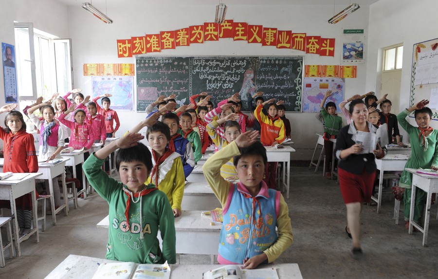Read moreStudents from ethnic minorities give the Young Pioneer's salute to their teacher (right) at a primary school in Uqturpan county, Xinjiang on May 3, 2012. The Chinese characters above the blackboard on the wall read, "Always be prepared to strive for the cause of communism". #