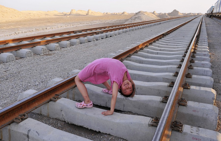 Read moreA daughter of a worker plays on the newly-built railway track on the Kumul-Lop Nor line's railway bed in Lop Nor, Xinjiang Uighur Autonomous Region, on July 18, 2012. #