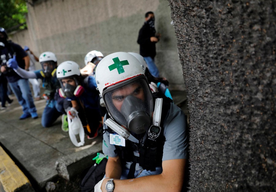 Read moreVolunteers, members of a primary care response team, kneel behind a tree during clashes with security forces at a rally against Venezuela's President Nicolas Maduro in Caracas, on May 1, 2017. #