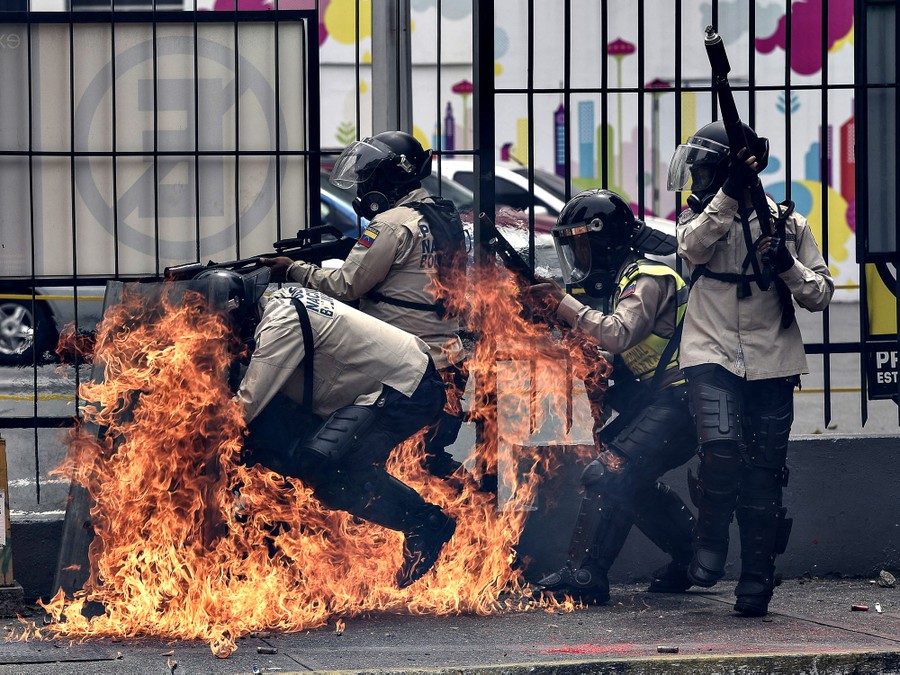 Read moreA group of riot policemen are hit by a Molotov cocktail hurled by an opposition demonstrator during a protest against President Nicolas Maduro, in Caracas on May 8, 2017. #