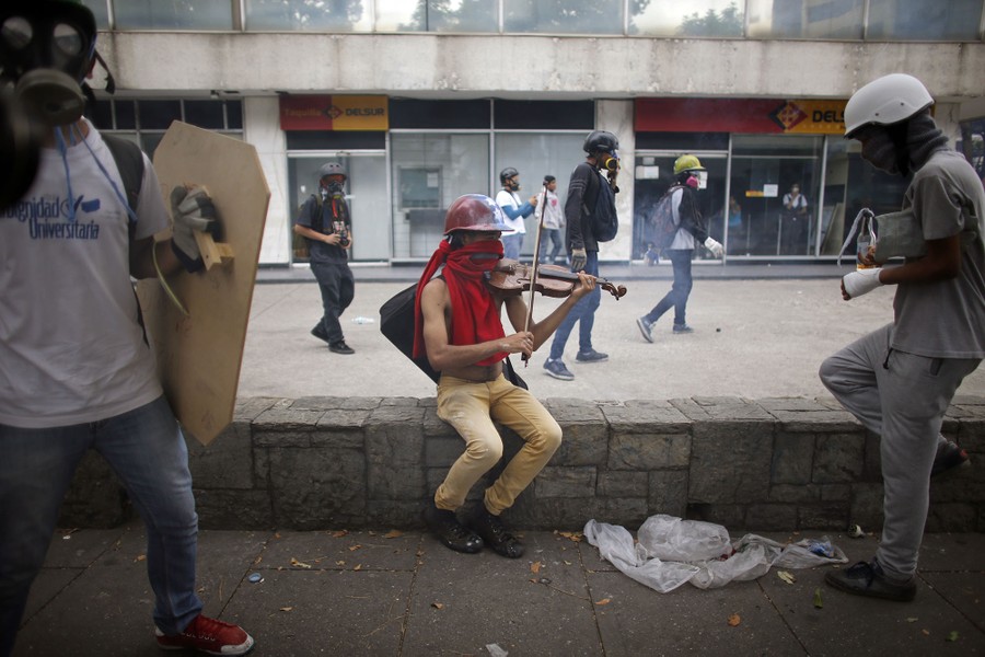 Read moreIn this Monday, May 8, 2017 photo, an anti-government protester plays a violin as security forces block a student march from reaching the Education Ministry in Caracas. #