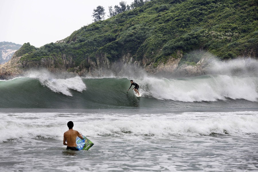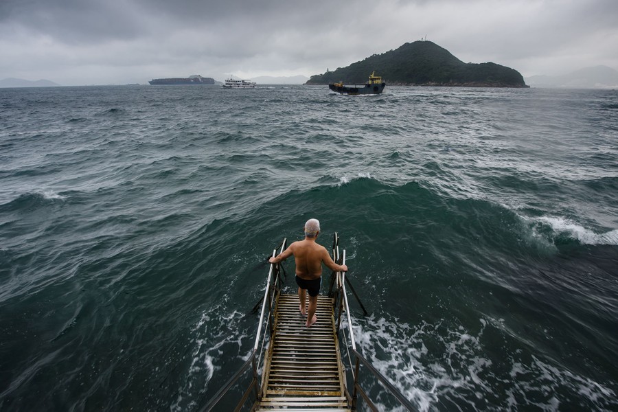Read moreLau Sam-Lan, 74, faces an approaching wave as he stands on a wooden pier below the "Sai Wan swimming shed" before swimming off the western tip of Hong Kong Island on June 2, 2017. Hong Kong's Victoria Harbour is one of the world's busiest ports, but every morning daring elderly swimmers dive in to its choppy waters against a teeming backdrop of ferries, cargo ships and fishing boats. #