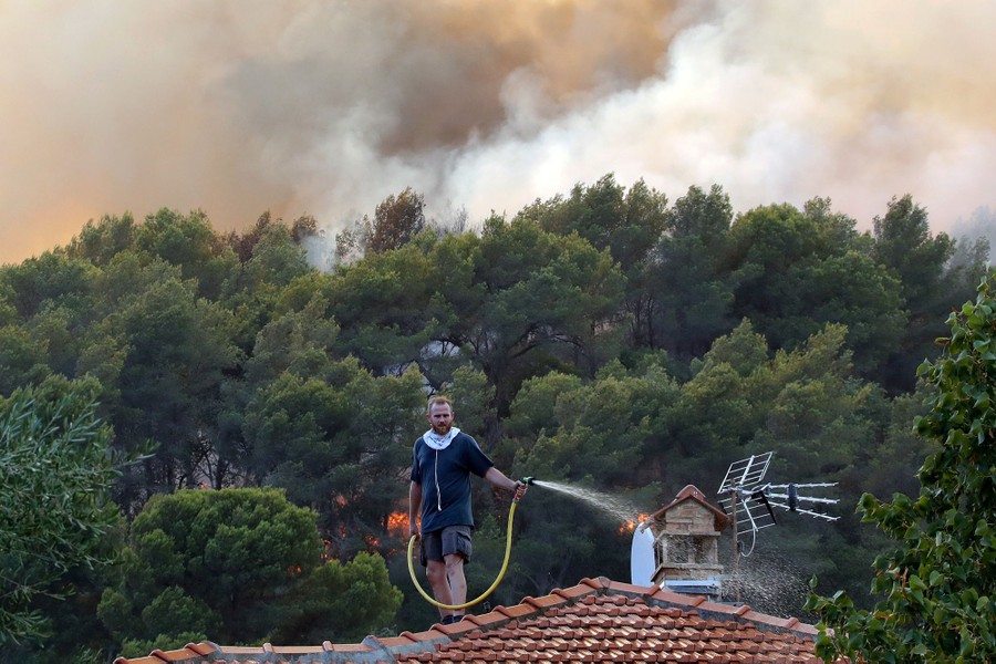 Read moreA man waters the roof of his house with a garden hose as a smoke from a burning wildfire fills the sky in Carros, near Nice, on July 24, 2017. #